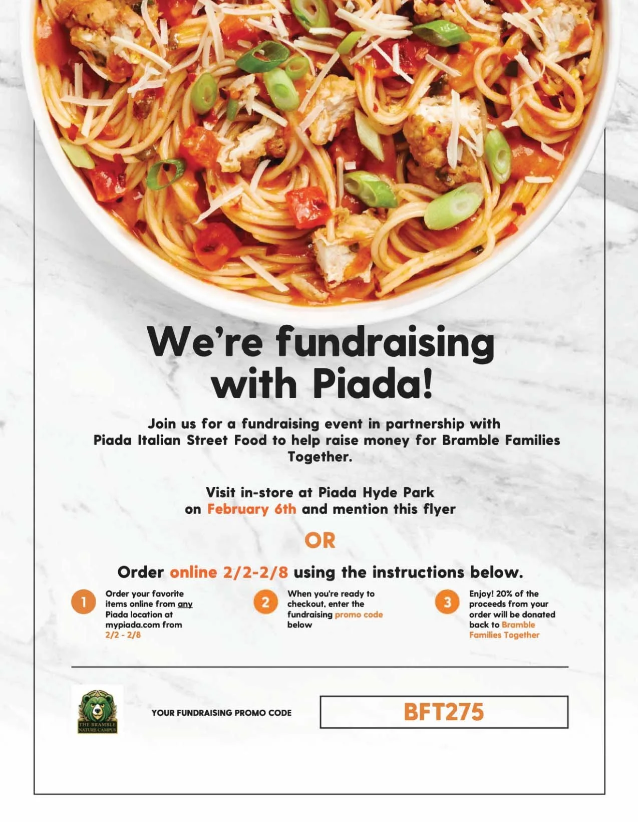 Additionally, there will be an IN PERSON fundraising day on Friday February 6 at the Hyde Park location. Simply mention that you are with the Bramble Families Together fundraiser to benefit our community. The Hyde Park Piada is located at 3780 Paxton Ave, Cincinnati OH, 45209.